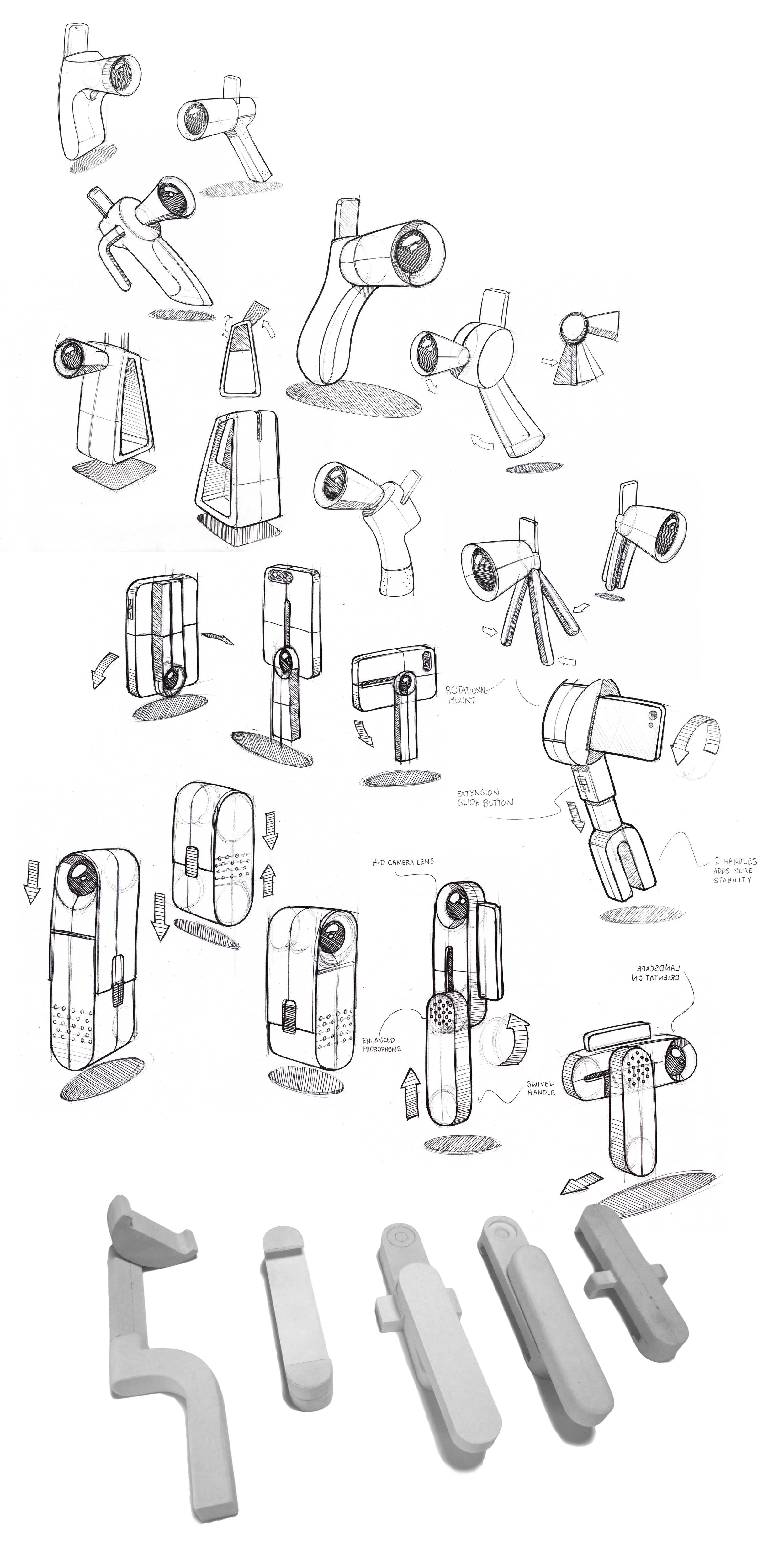 The final prototype uses a t-slot groove and an adjustable knob in order to allow the stabilizer to move from landscape to portrait. The form is able to fold on itself for a compact shape that is able to conveniently fit in the user’s pocket. The device has a USB charge battery that powers your phone when battery is low.